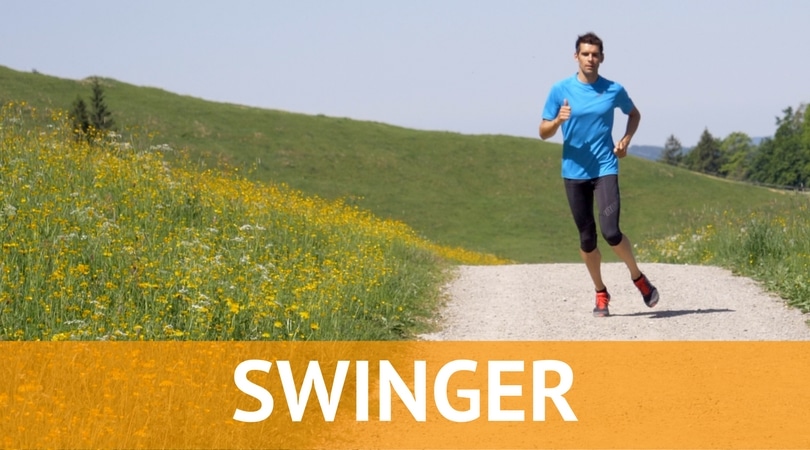 Wie bei einer Uhr pendeln die Füße des Laufstils Swinger seitlich nach vorne. Wenn du dich von vorne betrachtest, setzt dein Fuß nach einem Schlenker direkt vor deinem anderen Fuß auf – als ob du auf einem Seil balancieren würdest.